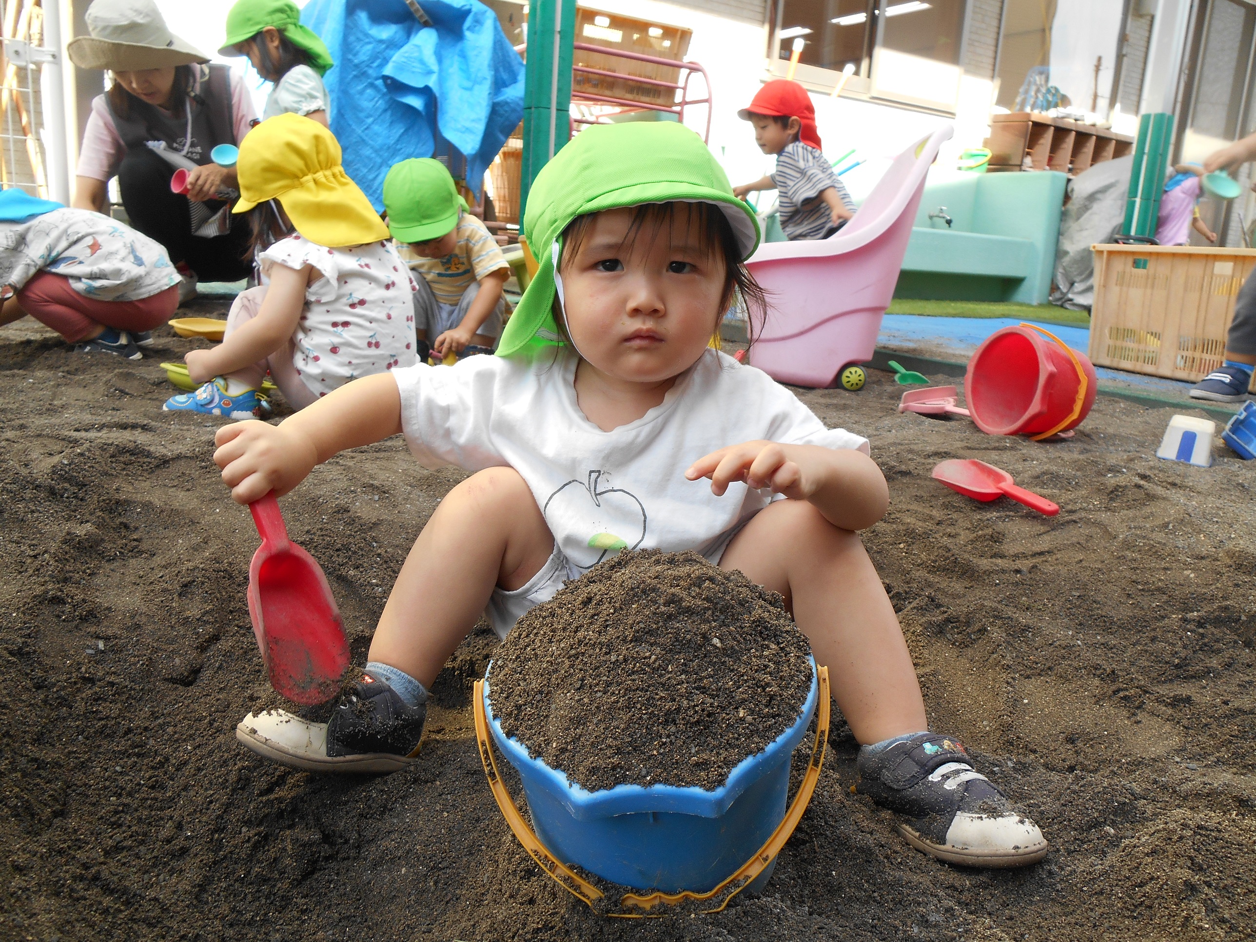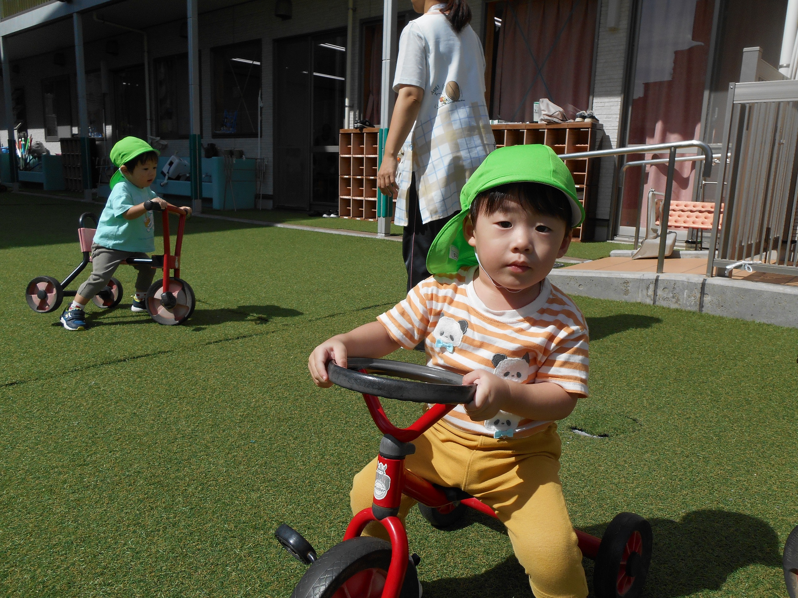 外へ出ると、滑り台、三輪車、砂場など好きな場所へ一目散にむかう子どもたちです。