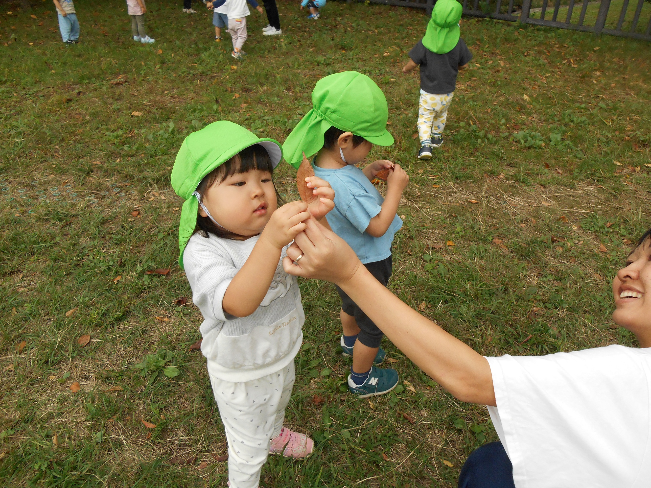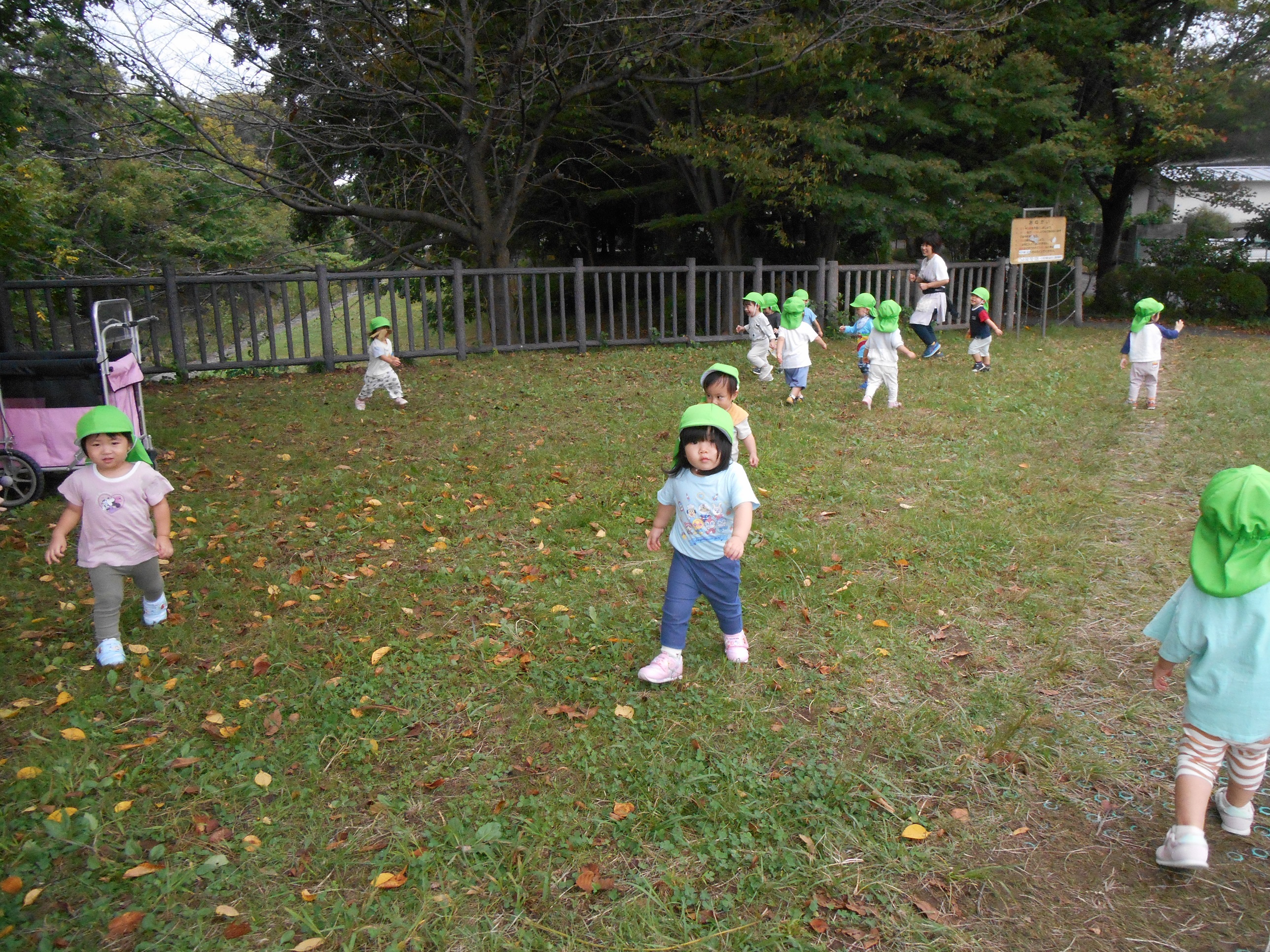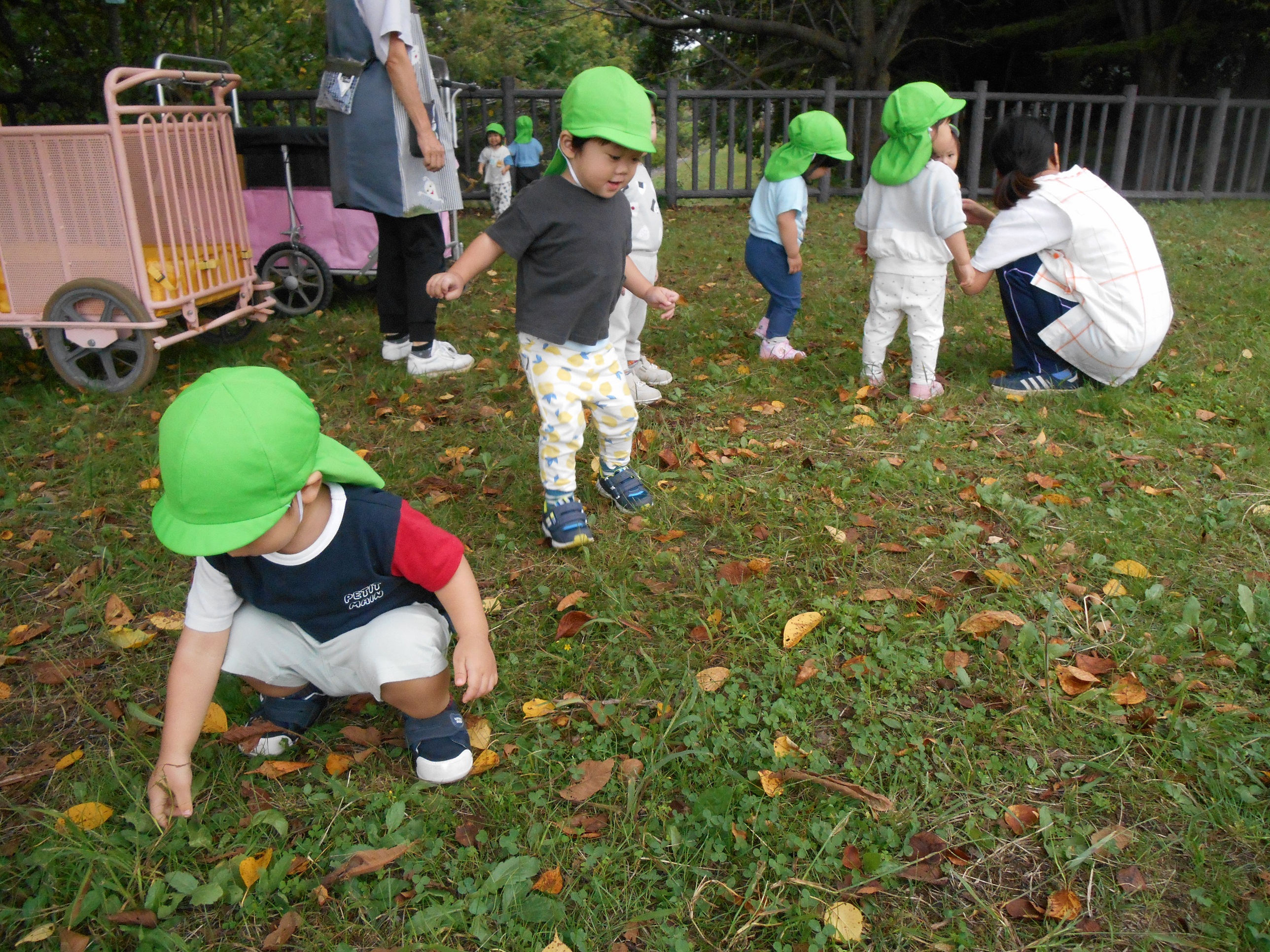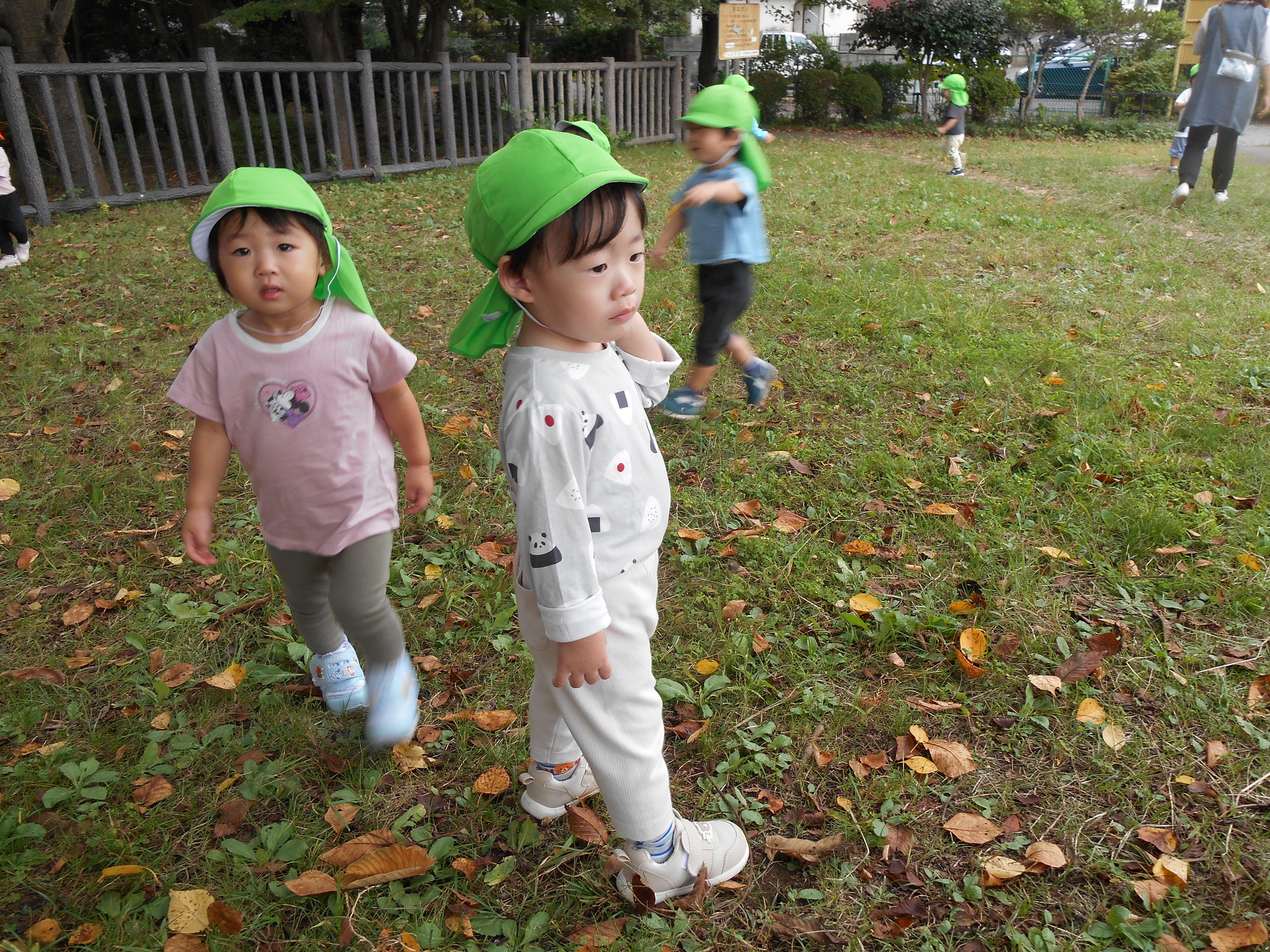 ようやく過ごしやすい季節となり久しぶりにお散歩へ行ってきました。広場には落ち葉があり、秋の気配を感じたり、他園のお友だちがいて少しの時間交流を持つことを楽しみました。