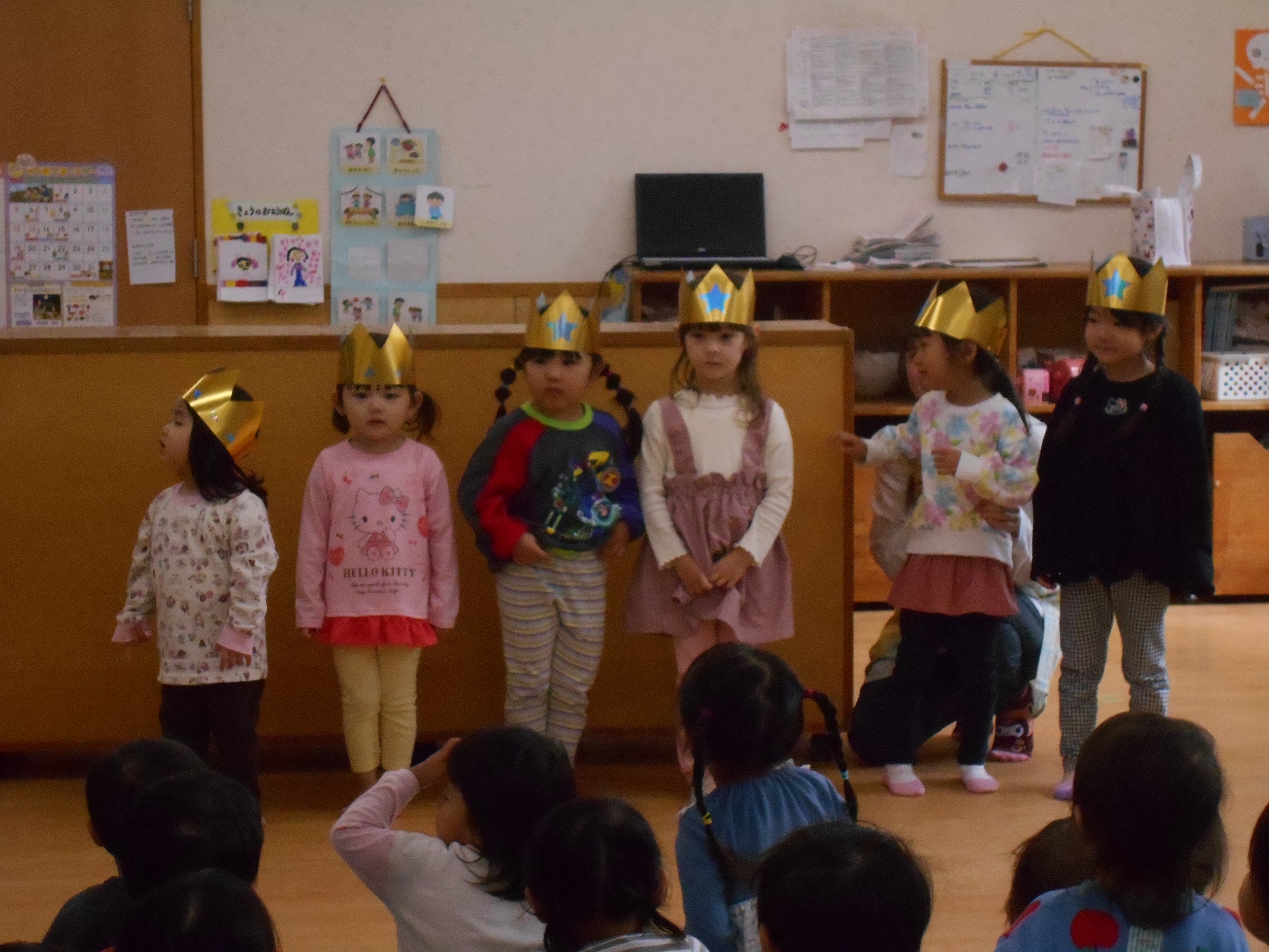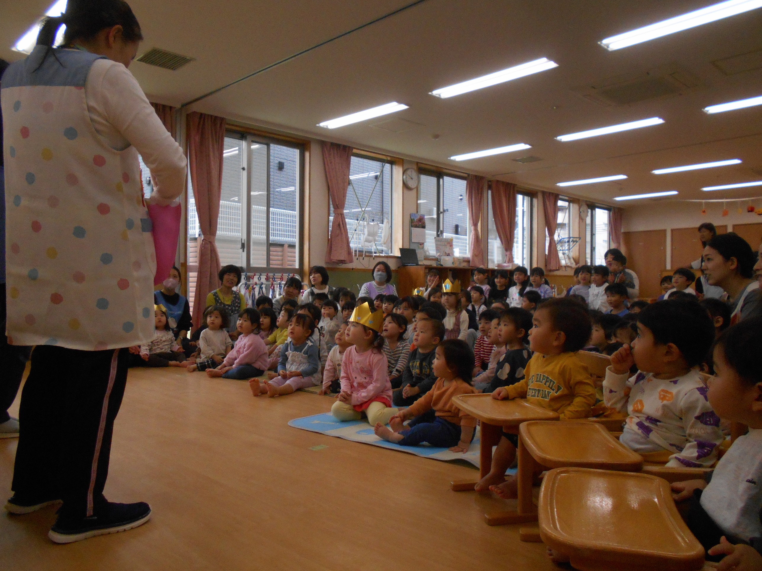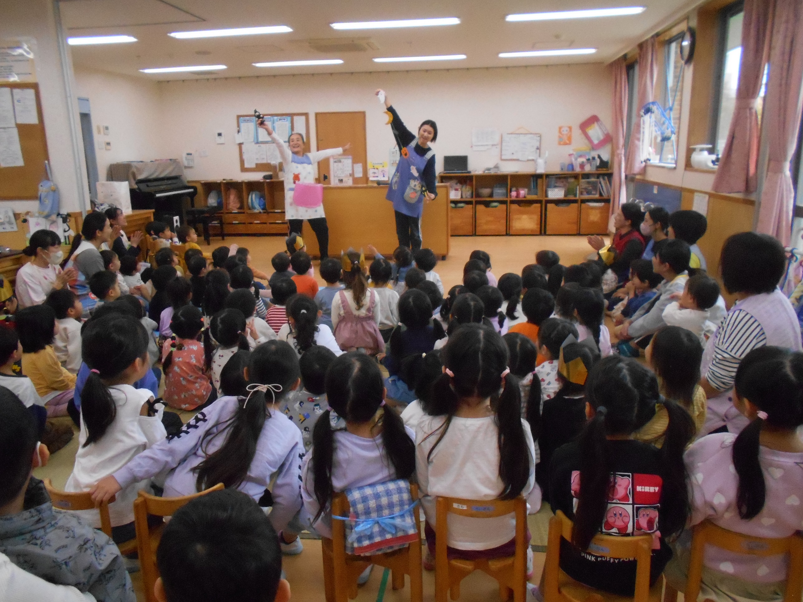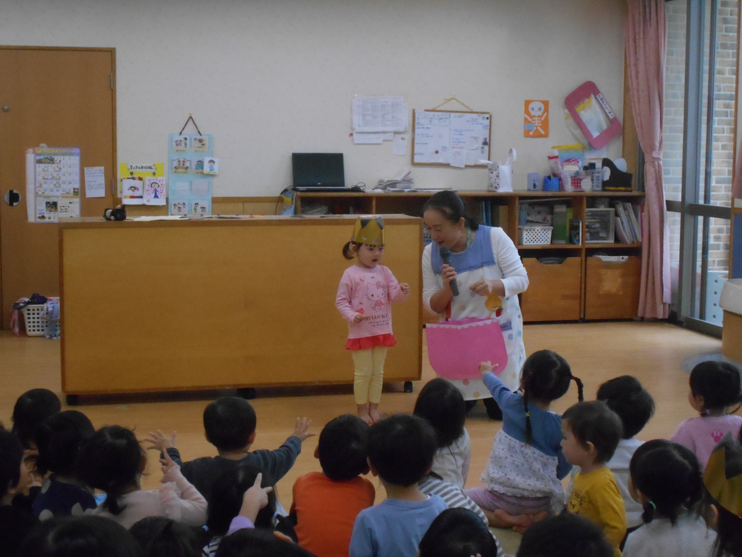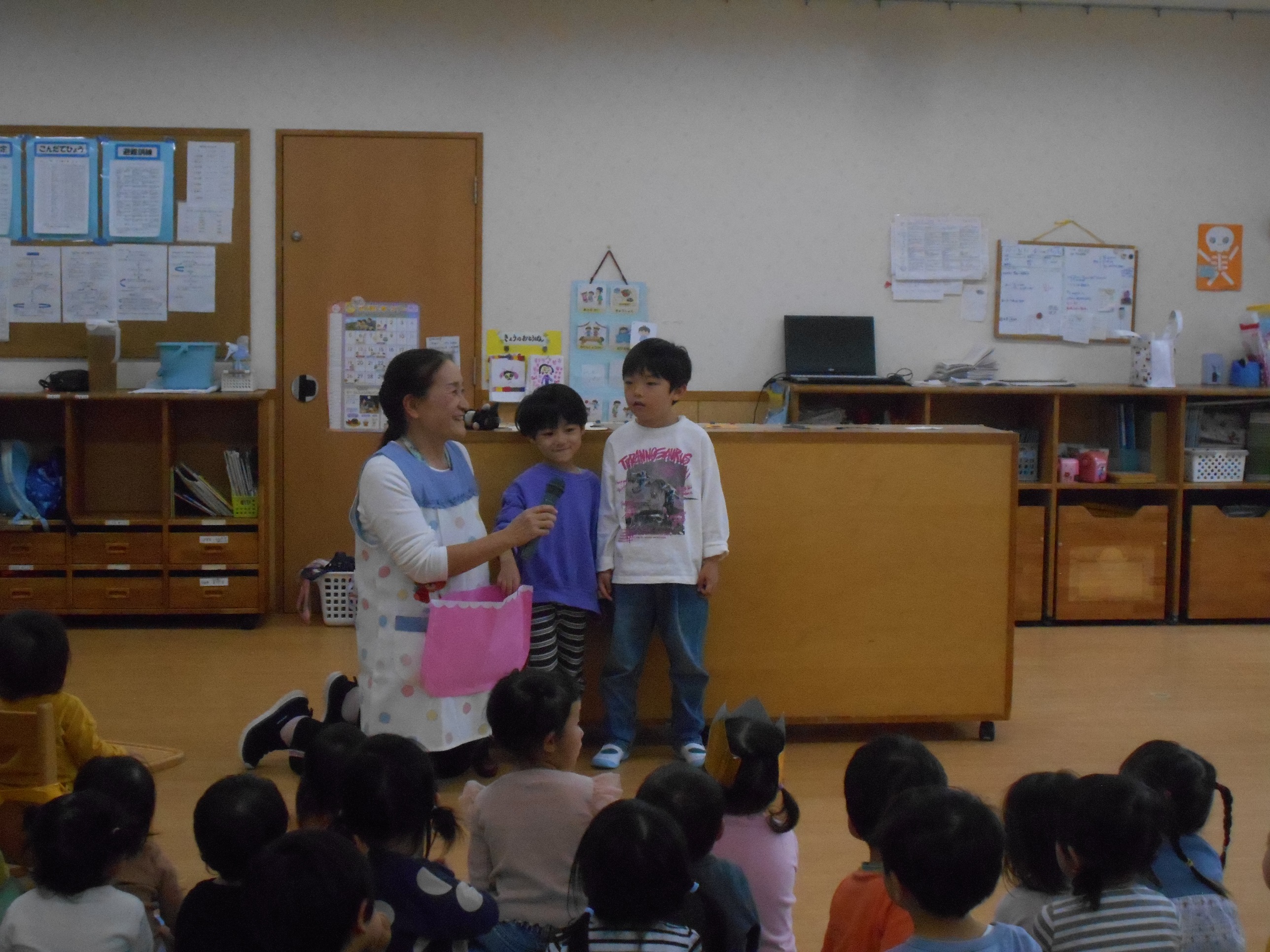 10/31(金)10月のお誕生会が行われました。誕生児はちょっとドキドキしている子もいれば、ニッコニコの子も…。それぞれインタビューに答えると、大きな拍手をもらいました。先生の出し物は「不思議なポケット」。特別なポケットから何が出てくるか?ワクワクしながら先生の大きなポケットに注目する子どもたちでした。