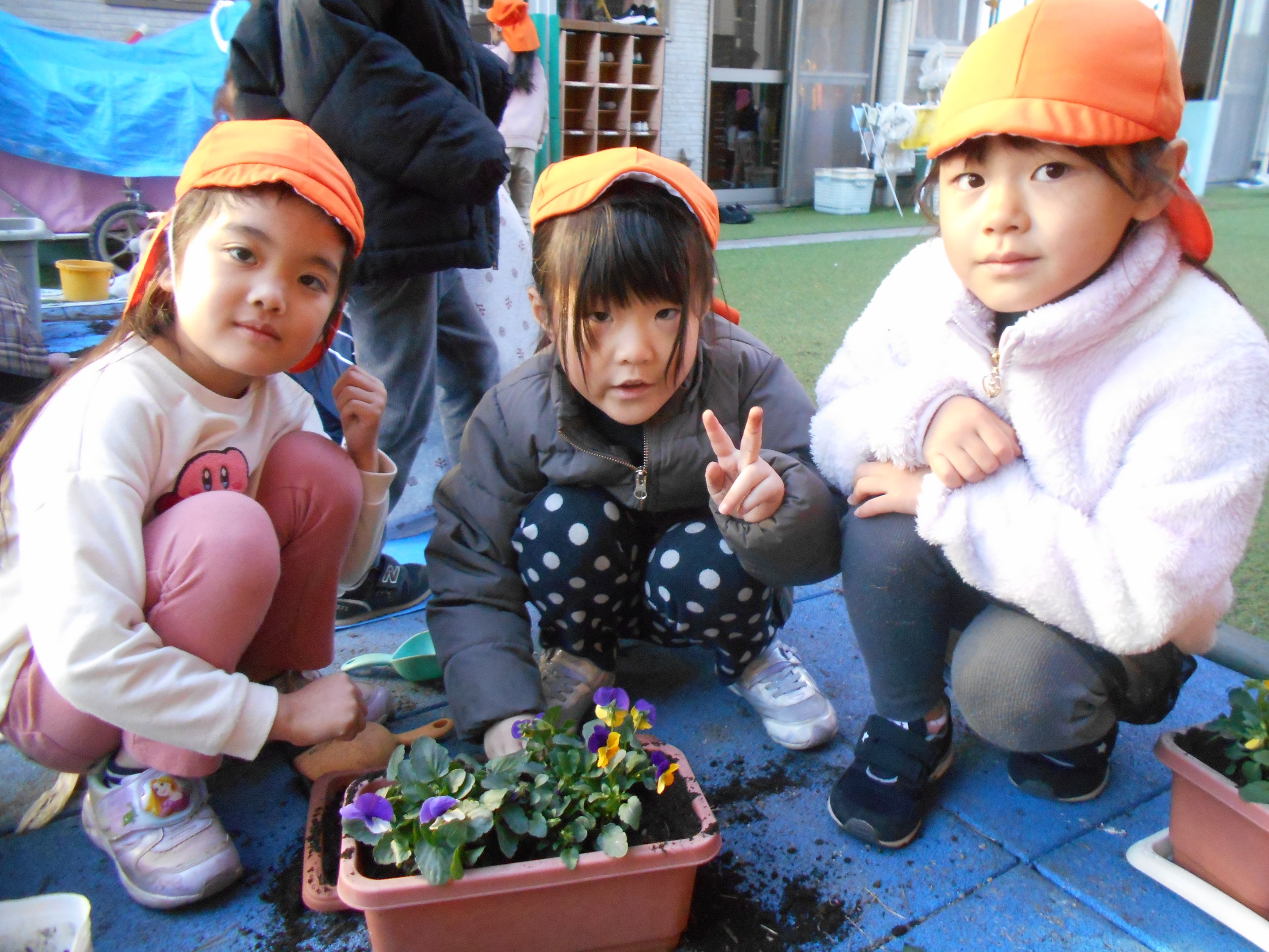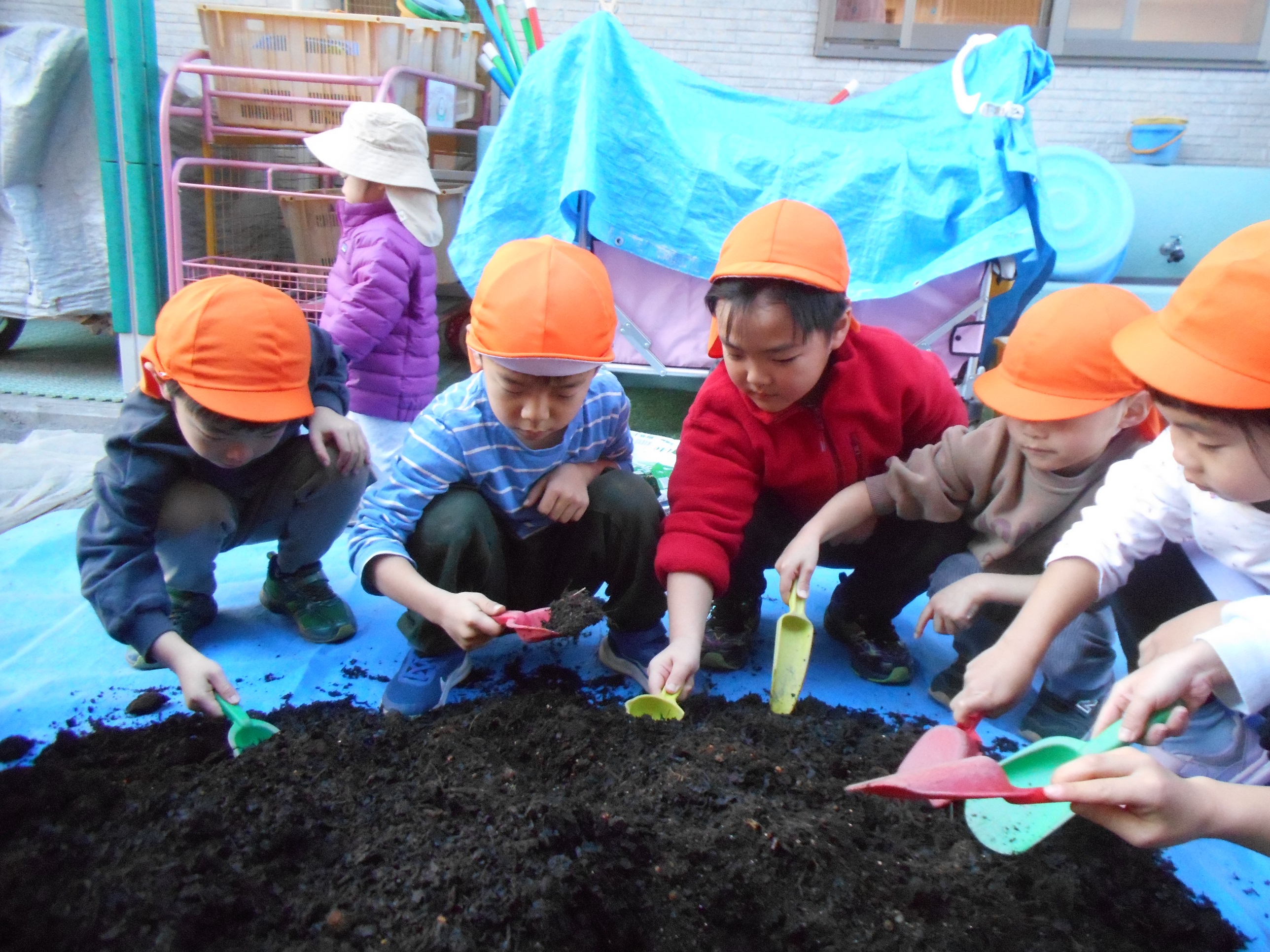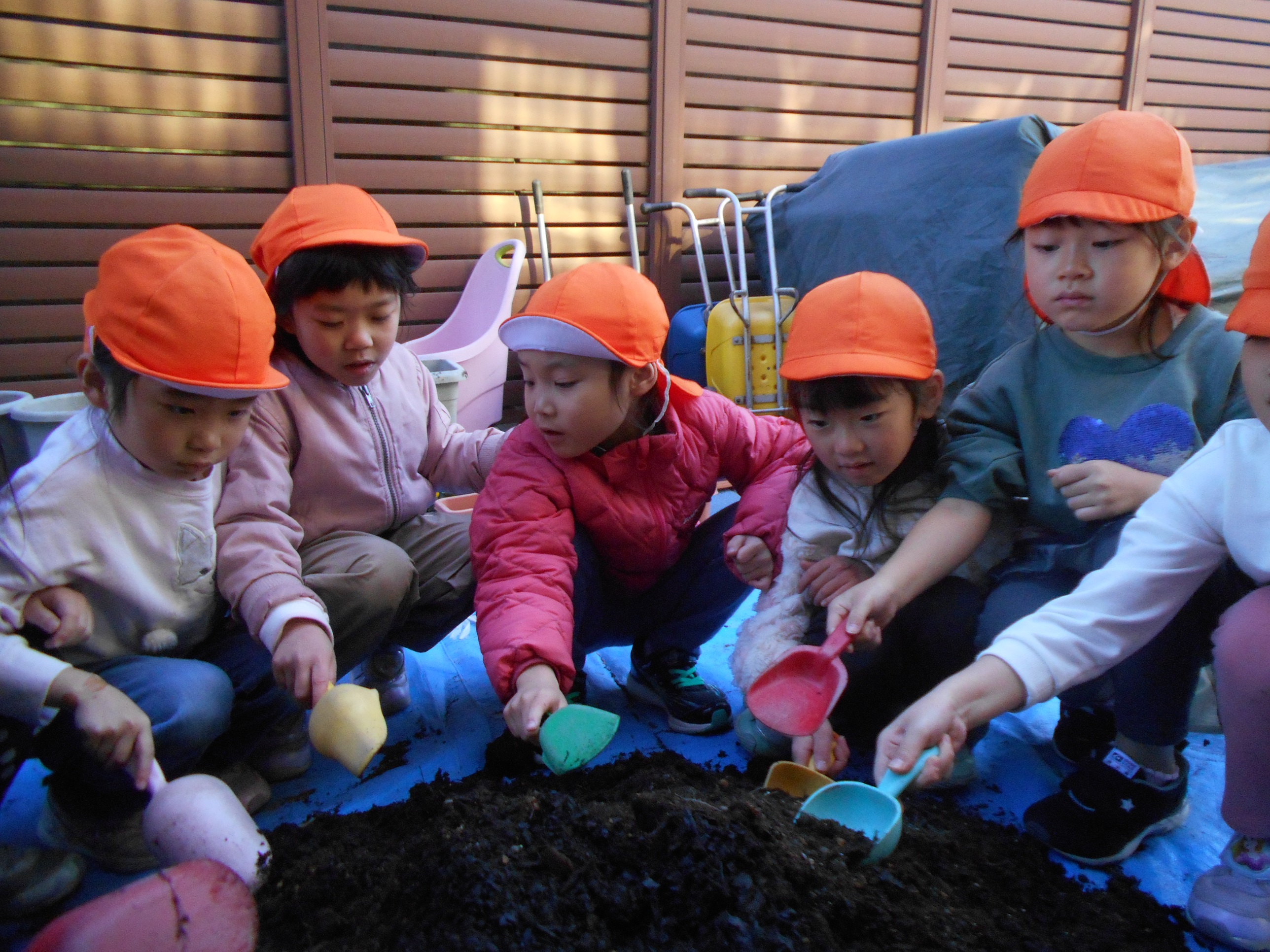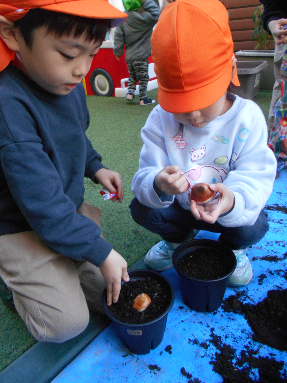 チューリップの球根を植えました。まずは土づくりから。ふかふかの土を作ったあと、球根を子どもたち一人ひとりのプランターに植え付けました。これから毎日お世話をしていきます。綺麗なチューリップが咲きますように…。