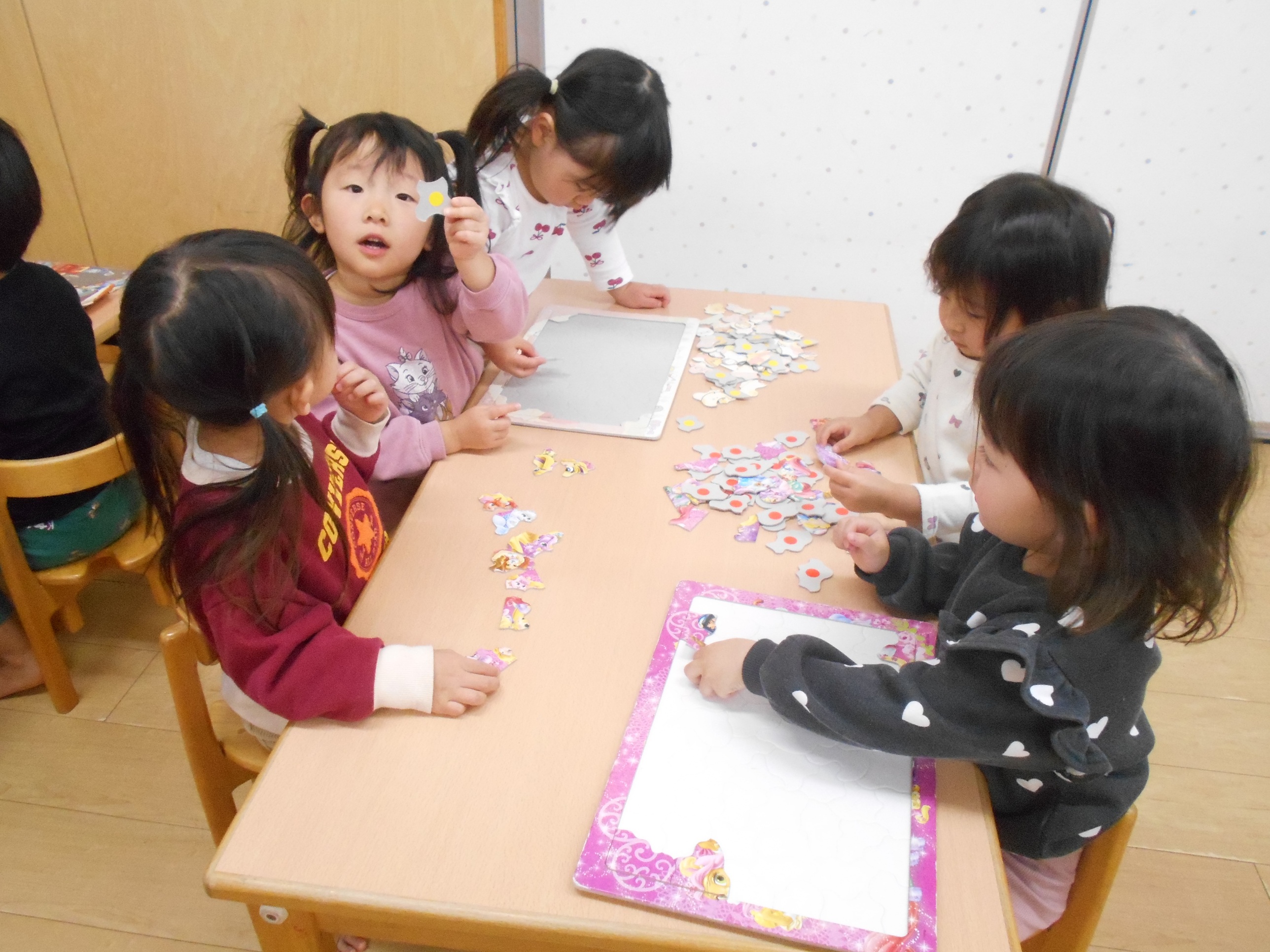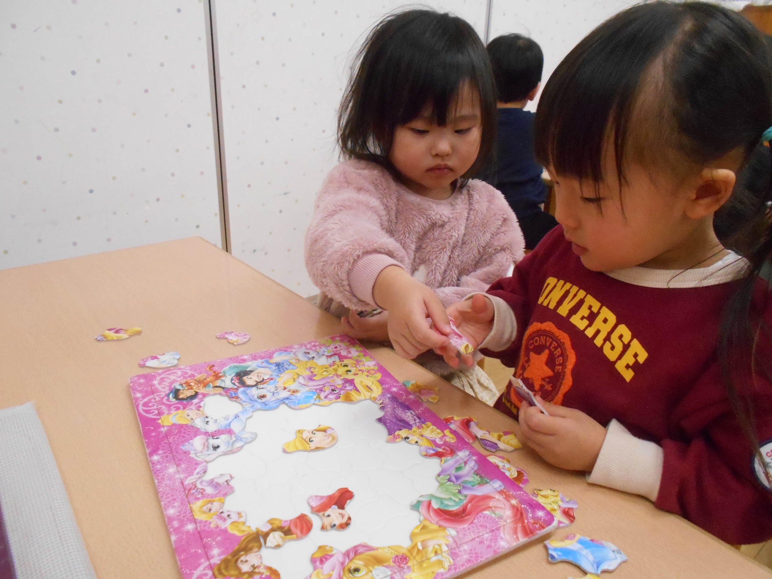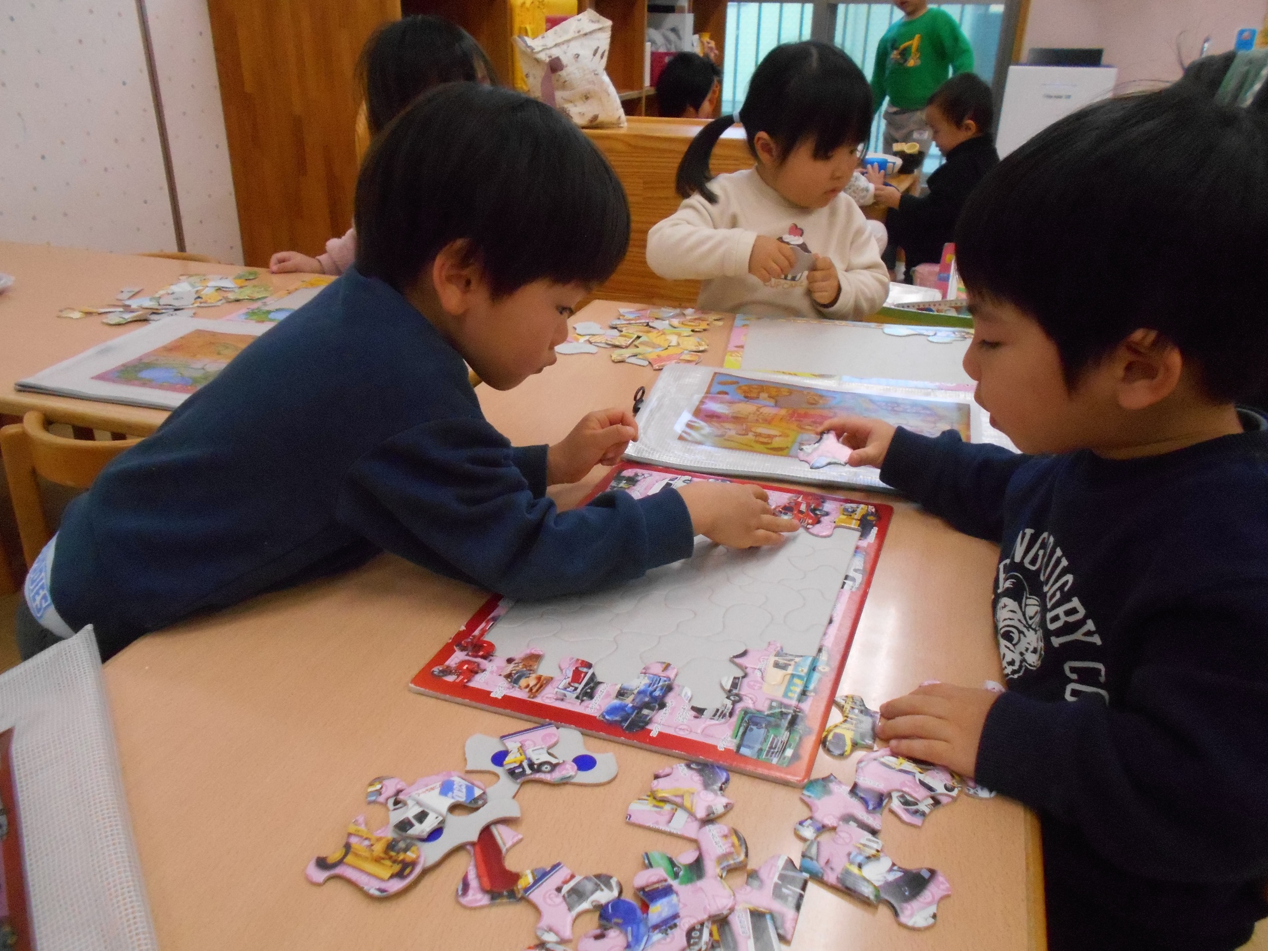 40ピースのパズルから始まり、今は65ピースのパズルに挑戦中。お友だちと協力しながら、はまるたびに大喜びです。
